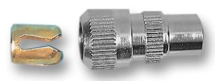 These are used in the UK for UHF TV and VHF radio aerial (antenna) connections. Co-axial cable is used and is prepared in a very similar way to that shown for F-plugs. The difference is that the centre conductor is left longer and is pushed into a hollow centre pin and usually soldered at the tip. The turned back braid is gripped by the piece of metal shown outside the plug below. The end cap is then screwed down onto it and the narrower part of the plug.