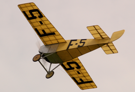 The large lightweight model marked F5 is a Ponnier D.III. It uses wing twist rather than ailerons. The servo pulls the rear of one wing down. A cable attached to the top of that wing runs over a pulley on the fuselage and pulls the rear of the other wing up. However down is larger than up so there is strong adverse yaw. The pilot told me that he has to apply reverse rudder before twisting the wings. He said it was a fast and tricky learning moment. The Ponnier came a very close second in the 1913 Gordon Bennett Trophy race to a Deperdussin Monocoque.