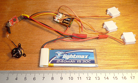 And here is my latest experiment - micro radio control for indoor or calm garden flying. This complete four channel set has a brushless motor, an electronic speed controller (ESC), a receiver, three servos and a lipo battery (shown un-connected). The metric rule shows the size, and the scale below shows the weight in grams. For those non-metric amongst us, there are 28 grams in one ounce.