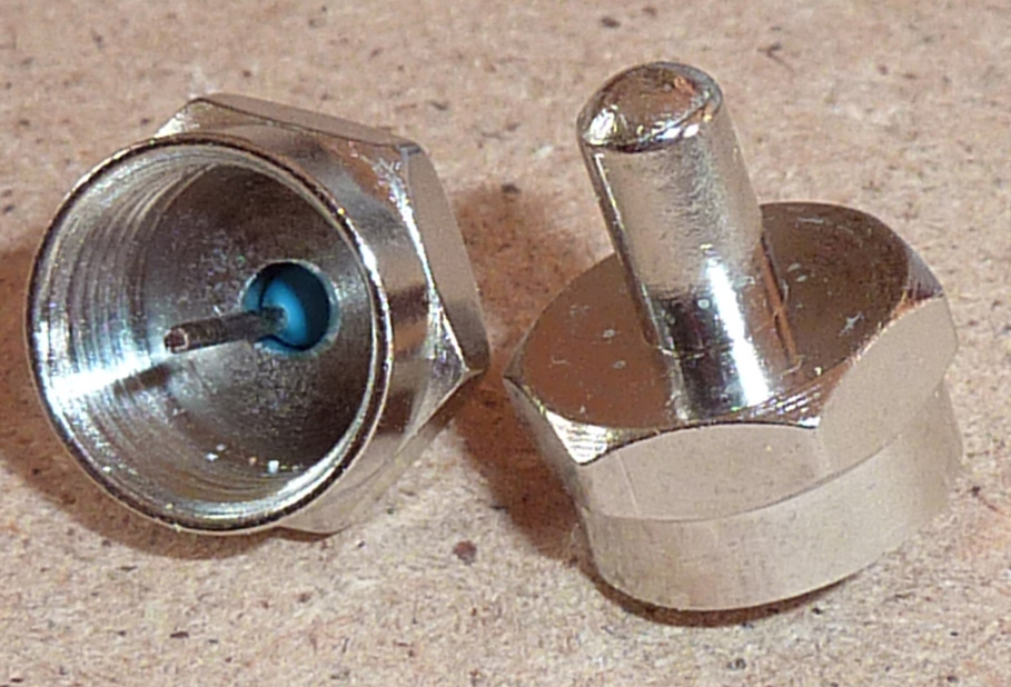 This is one of my head-end boards installed in a loft. This accepts the four trunks from a quatro LNB into the F sockets on the bottom of the multiswitch and could take a set of terrestrial aerials into the fifth socket on the left side. It provides endpoint connection sockets for eight satellite boxes, freeview boxes, analogue TVs, and DAB or VHF FM radios. The earth bonding strip is at the bottom of the board. Note that each of the four currently unused outlets on it has a terminator, an example of which is below. Such a multiswitch is called a 'terminated multiswitch'. It is mains powered and can power other devices such as amplifiers and cascade switches described later.