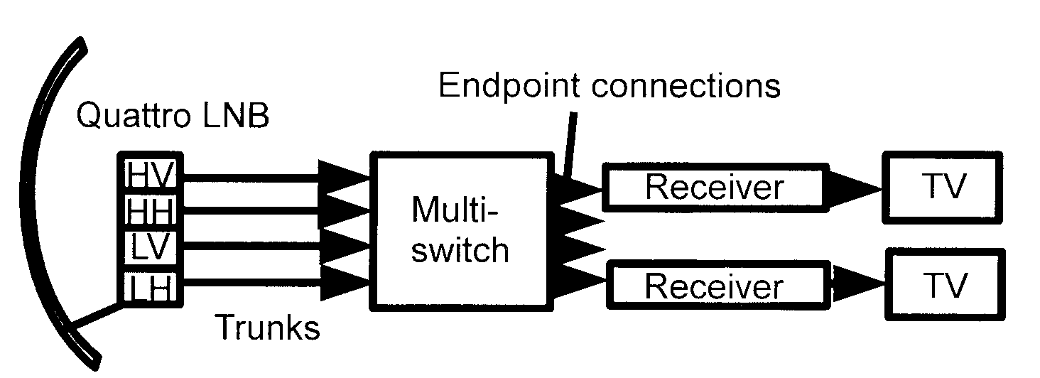 You need a quatro LNB. This has four outputs like a quad. However each is fixed to one of the band/polarisation combinations. Four cables, called ‘polarity trunks’, carry these four signals to a ‘multiswitch’. This combines the signals so that all four are available at each of several outputs. There is one output for each endpoint connection to a receiver. Each receiver can then choose which signal it uses based on the programme channel selected by the user. Each endpoint output is like a separate universal LNB. Multiswitches might have four, eight, sixteen or more outputs. When deciding how many you need, remember to allow for two sockets in rooms where you will use a recorder.