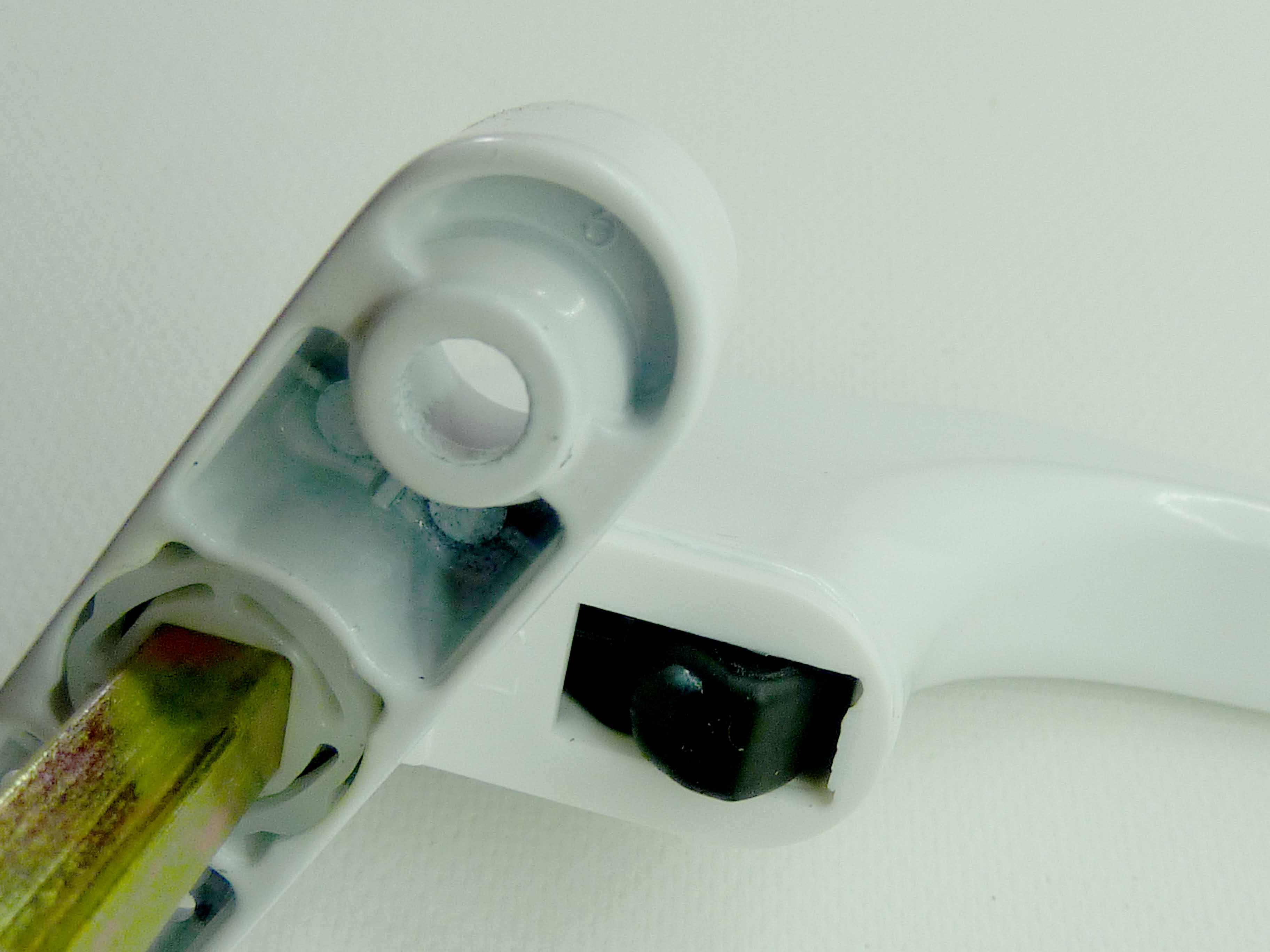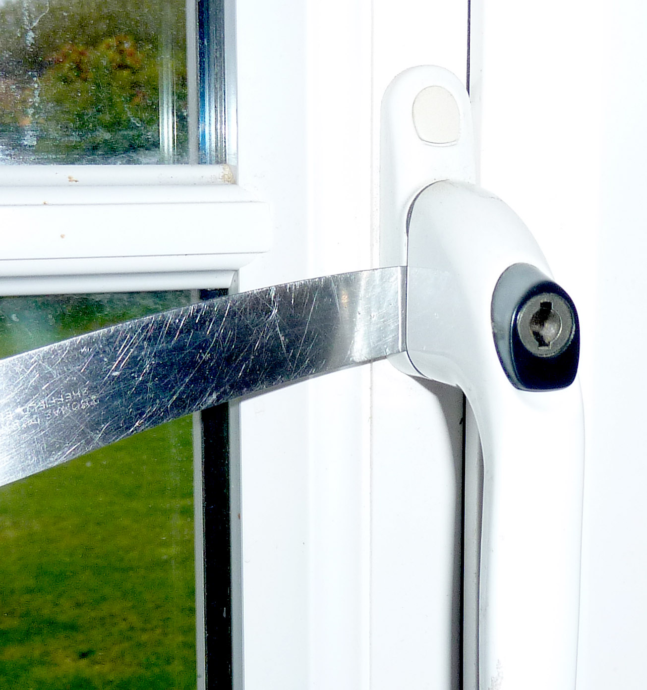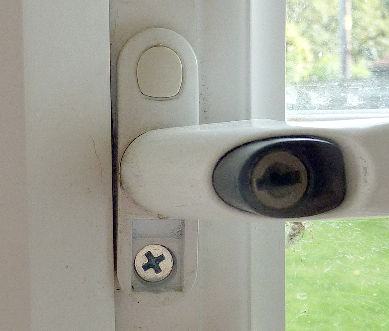 If you have had your plastic (sorry uPVC) window units in for more than a few years you will probably try to open one and find the handle won't turn. You check that it isn't locked but it still won't budge. What has happened is that a tiny bit of plastic that locks the handle until you press the button has broken inside the handle. Two screws hold the handle onto the frame. One is hidden under the handle for security reasons. The other is hidden by a removable plastic plug. The picture shows the piece of plastic.