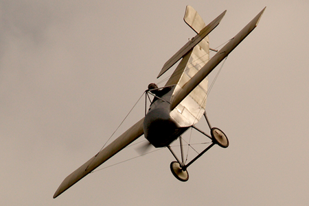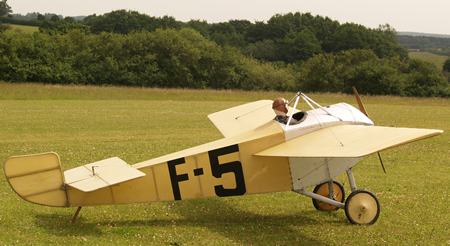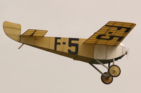 The large lightweight model marked F5 is a Ponnier D.III. It uses wing twist rather than ailerons. The servo pulls the rear of one wing down. A cable attached to the top of that wing runs over a pulley on the fuselage and pulls the rear of the other wing up. However down is larger than up so there is strong adverse yaw. The pilot told me that he has to apply reverse rudder before twisting the wings. He said it was a fast and tricky learning moment. The Ponnier came a very close second in the 1913 Gordon Bennett Trophy race to a Deperdussin Monocoque.