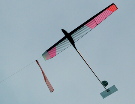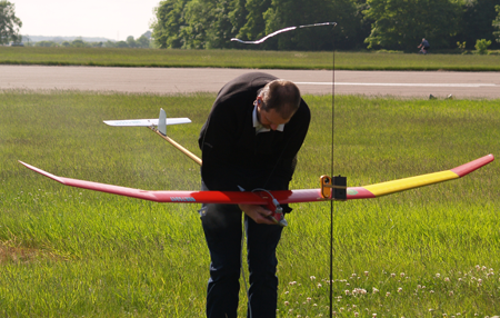 The gliders were beautiful but I am not sure how many were self-built. The bunt-release was interesting. It is a high speed run to get the model and line whisting then a sharp half-loop on release followed by a half-bunt caused by servo-driven down on the tailplane. I didn't see any height gain near to double height but the best launches gained one third on the 50m.