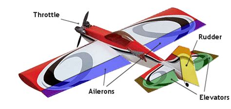 Hinged on the rears of the wings are two ailerons. These create roll, where the aircraft tips over. To roll left the left aileron goes up and the right goes down. They are normally in the outside half of the wing but are sometimes full span. Usually the ailerons also cause the aircraft to turn but not on some high performance aircraft. To yaw there is a rudder hinged on the back of the fin. The aircraft turns but does not tilt. To pitch the nose up or down there is an elevator hinged on the back of the tailplane. It is possible to fly with only two of the control surfaces, or even one, but most model aircraft have all three. The throttle varies the power that the engine or motor produces.