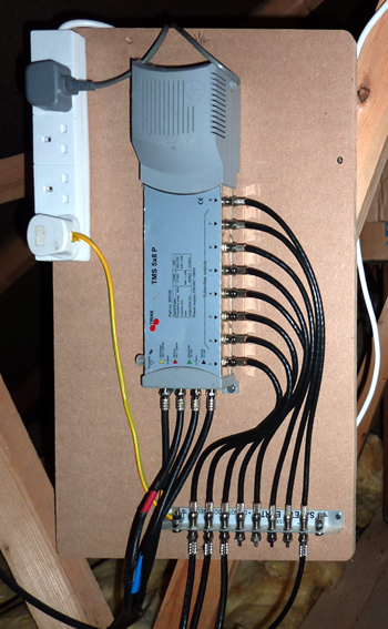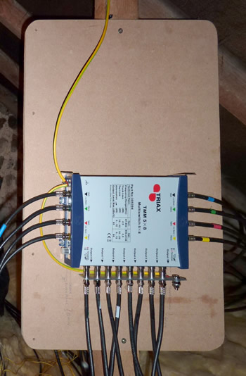 This is the same cascade switch installed in a loft. The trunk cables are colour-coded with heat shrink sleeving so they don't get mixed up. This model has a built-in earth bonding strip. It also amplifies the signals before sending them on to the terminated switch. The amount of amplification can be adjusted with small controls on the bottom of the device. Note the space on the board for future expansion.
