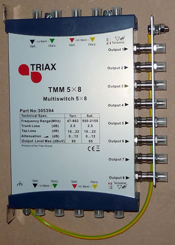 This is a cascade multiswitch. Notice that it has five inputs on the top for the four polarities from the quatro lnb and a terrestrial aerial. There are five outputs on the bottom to carry the signals in trunk cables to the terminated multiswitch shown above. This model has eight outputs to endpoints, but it can be bought with up to thirty-two. This switch is not mains powered, as it gets its power from the terminated switch through the trunks.