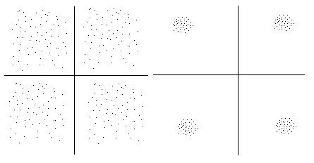 If you want to find out what it means, take a deep breath and drink a large cup of coffee. Then read the entry in the glossary. Then look it up in Wikipedia, and then give up. All you need to know is that a large cloud of dots filling each quadrant is bad (left-hand diagram), showing lots of various errors in the data, and a small cloud well out from the middle is good (right-hand).