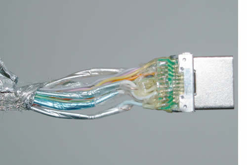 This is a cut-away HDMI cable showing the connector and the many cores.